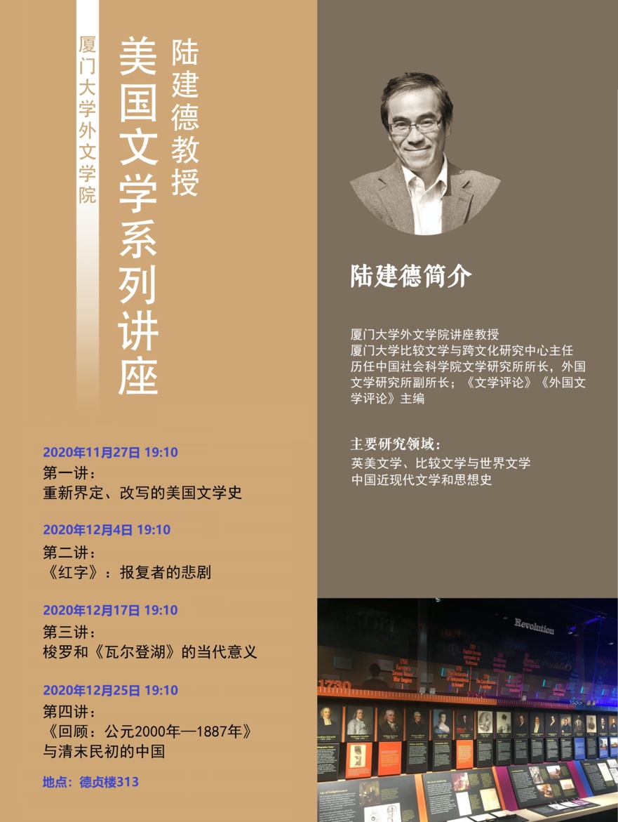 本次陆建德教授的美国文学系列讲座,承接他于2019年10月至12月在厦门大学外文学院举办的英国文学系列讲座,以“重新界定、改写的美国历史”开始,探索美国文学的渊源,接下来的三讲将以具体的十九世纪美国文学文本(《红字》、《瓦尔登湖》、《回顾:公元2000年—1887年》等)细讲文学、历史与社会的关系,欢迎大家积极参与和持续关注。