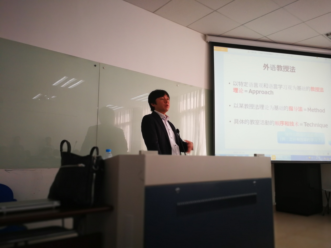 之后,古川智树副教授为在座师生开展了关于“外语教学方法的转型与翻转课堂”这一主题内容的讲述。古川副教授通过列举外语从古至今的教学方法引发现场同学们的思考和讨论,并为在场师生细致地介绍了文字翻译、军队式教学等具体的外语教学方法。在此基础上,古川副教授引出了现如今一个新型的外语教学模式——翻转课堂,即提倡学生通过课前事先预习,课堂上主动与老师交流的方式提升外语教学的成效与交互性。