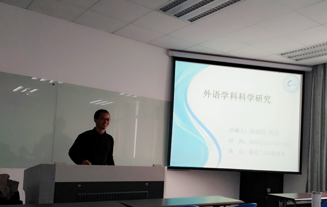 2016年12月15日上午十点,上海交通大学外国语学院杨炳钧教授为外文学院师生做了主题为“外语学科科学研究”的讲座,这场讲座是厦门大学外文学院第九届研究生学术研讨会的系列活动之一。讲座在南光三415会议室顺利开讲。作为本次学术研讨会的特邀嘉宾,杨教授以其深厚的学术功底和高超的科研能力,让所有参加此次讲座的师生受益良多。讲座由学院副院长辛志英教授主持,英语系主任杨士焯教授等专业教师、博士生和硕士生等参加了此次讲座。