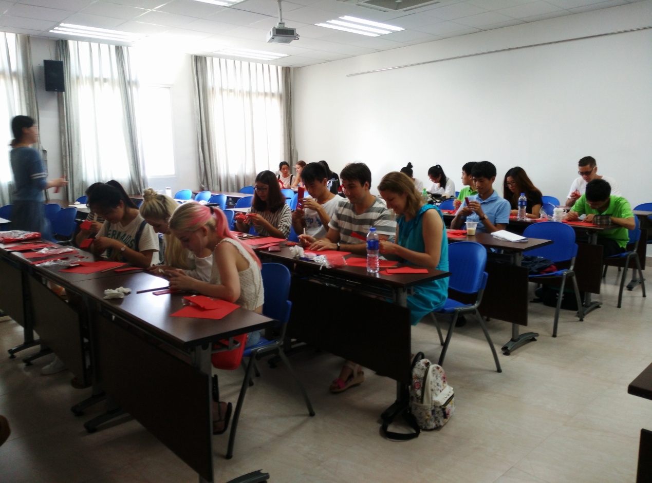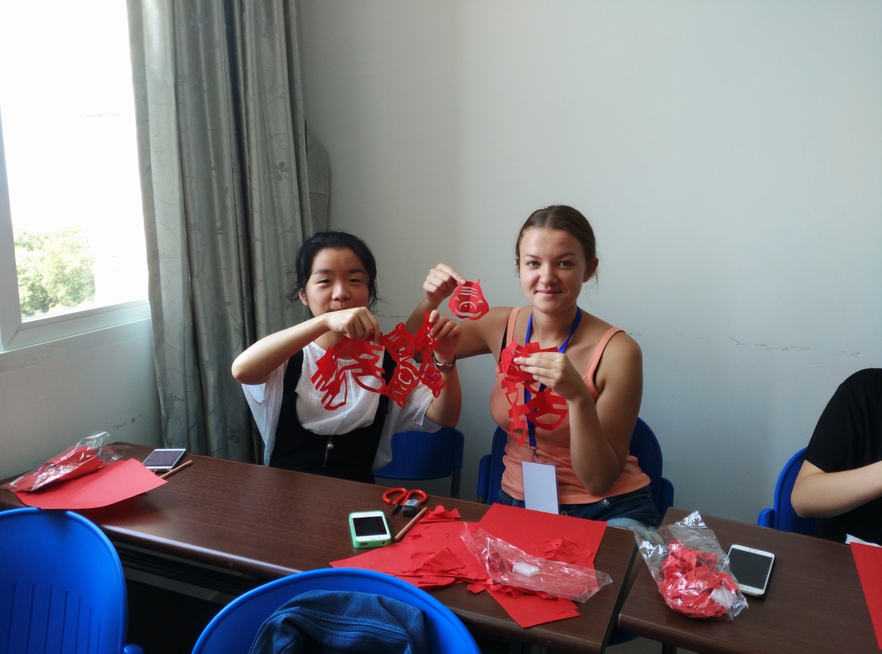 7月16日,在这个普通的周六,华体网俄语专业师生与来自俄罗斯的伙伴们进行了一场别开生面的“课堂教学”。上午9点,大家在外文学院415教室,先欣赏了一小段关于中国剪纸文化简介的视频,随后,在两名学生的中俄互动讲解中,开始了中国剪纸的学习。