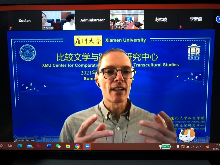 7月16日晚,美国哈佛大学Byron and Anita Wien英语与比较文学讲席教授、《诺顿世界文学选集》总主编马丁·普克纳(Martin Puchner)教授在线上为广大师生带来了题为“Literature for a Changing Planet”的精彩讲座。本次讲座是厦门大学比较文学与跨文化研究中心高端系列讲座第二季的第四讲,由厦门大学比较文学与跨文化研究中心主任陆建德教授主持。普克纳教授以生动的语言、宏大的视角讲述了历经几千年的文学发展史,揭示了世界文学概念背后的生态思维,并启发我们聚焦文学作品所展现的人与环境的关系,从中获得处理当今环境问题的灵感。