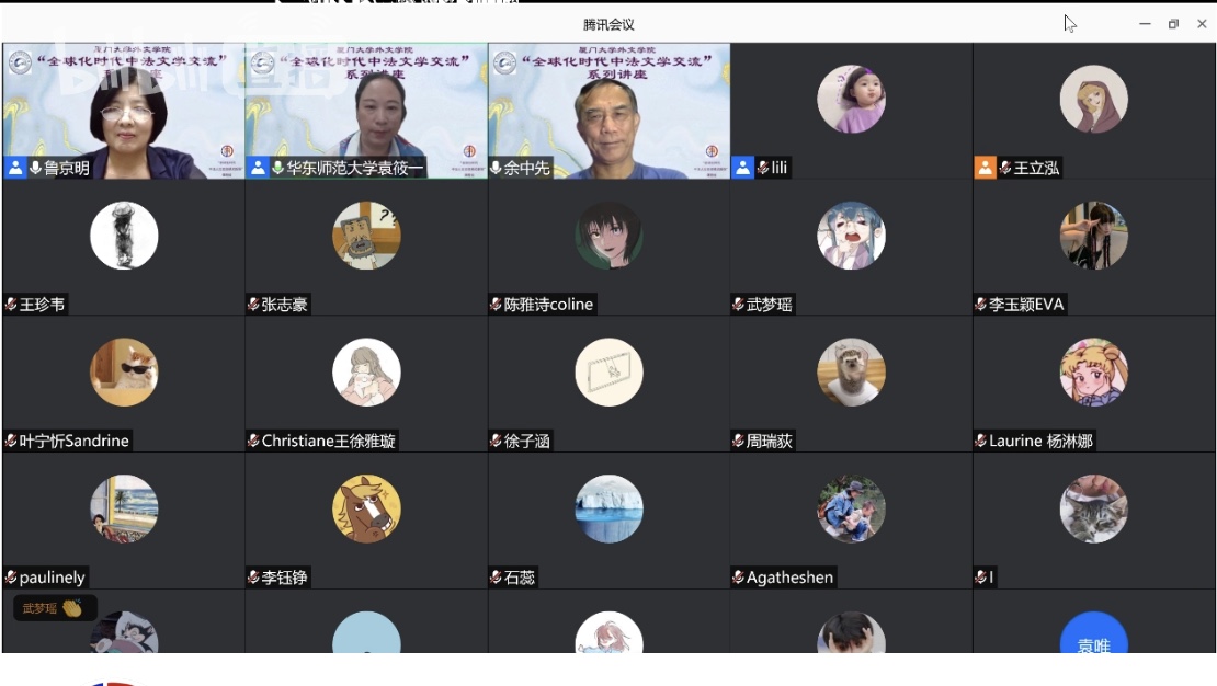 讲座的最后,袁筱一教授与、余中先教授、鲁京明教授共同探讨了新世纪法语文学的走向,并为听众们做了精彩的总结。在几位教授的梳理和启发下,与会的老师和同学们都收获颇丰。至此,由厦门大学外文学院“全球化时代中法人文交流模式新探”课题组举办的“全球化时代中法文学交流”系列讲座的第一讲圆满完成,在此过程中,1200多位听众汇聚云端聆听袁筱一教授的精彩演讲,收获满满、受益良多,且让我们共同期待下一讲的精彩继续!