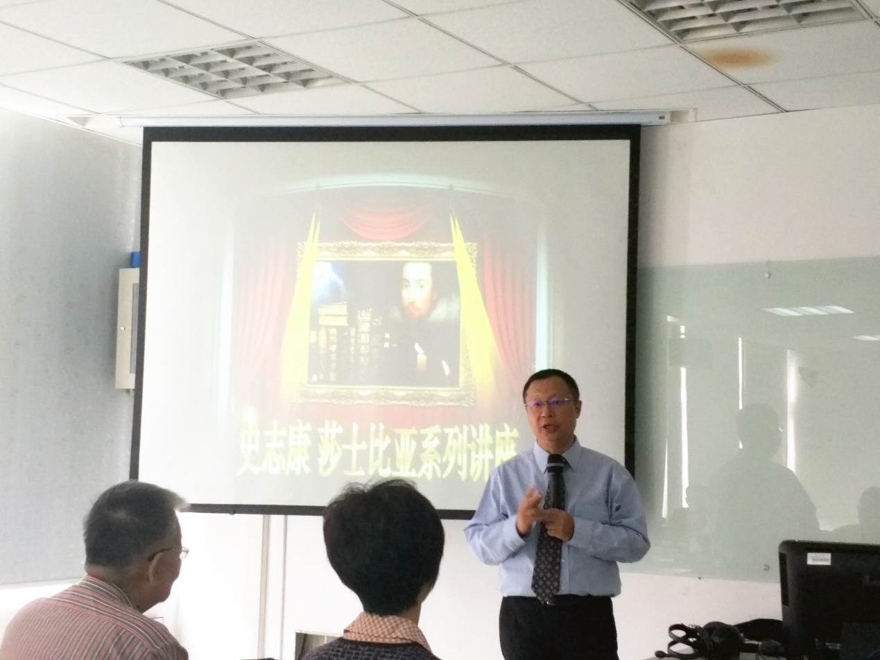 杨仁敬教授首先对史志康教授作了介绍。史教授曾任上海外国语学院英语学院院长、中国英语研究会副会长,现任上海外国语大学教育培训中心主任、中国英国文学学会副会长及上海外文学会党组书记、常务副会长;他曾在法国巴黎担任联合国教科文组织临时雇员,从事文件翻译,曾获得“宝钢教育基金优秀教师奖”、“霍英东教育基金优秀青年教师奖”等全国奖项。杨仁敬教授表示,史教授对莎士比亚作了长期且深入的研究,成果颇丰,希望在座师生仔细聆听、认真思考。