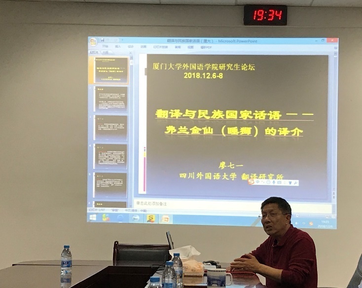 12月6日晚厦门大学外文学院迎来了四川外国语大学的廖七一教授,廖教授为外文师生带来了题为“翻译与民族国家话语——弗兰金仙(睡狮)的译介”的精彩讲座。