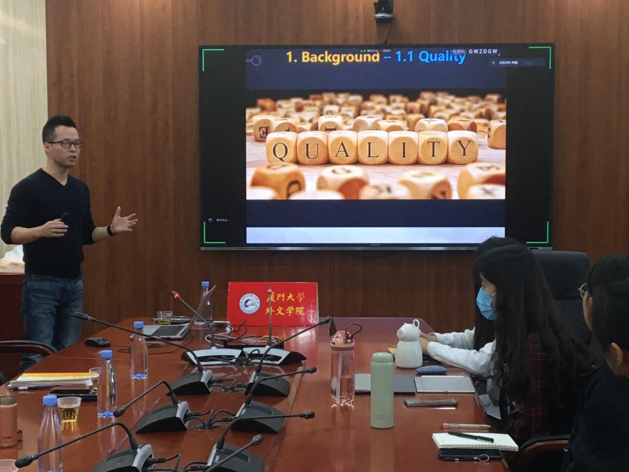 本场讲座的主讲人为厦门大学外文学院韩潮教授,讲座的主题为“口译质量评估:人工与机器测评”。厦门大学社科处副处长张随刚主持讲座。