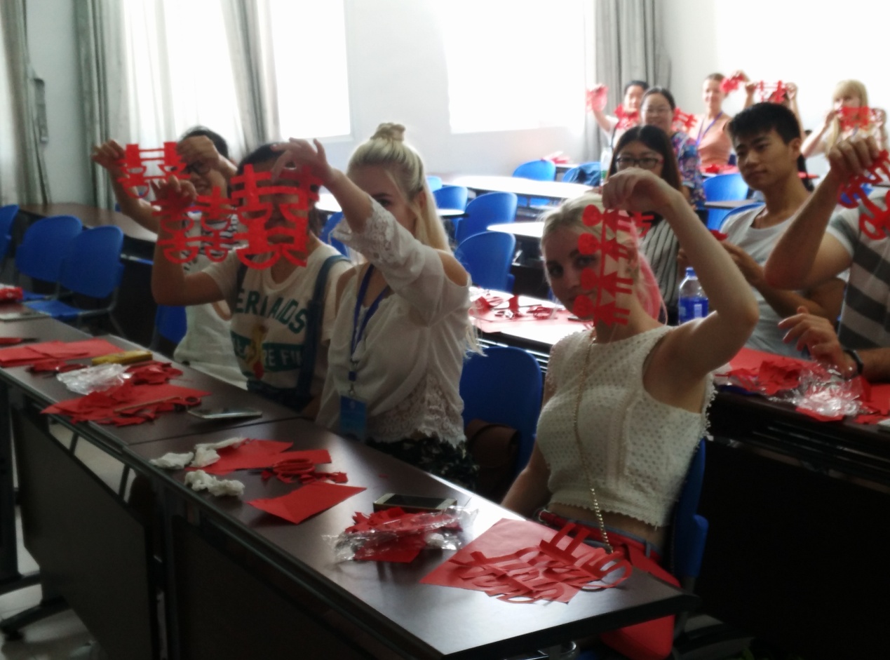 7月16日,在这个普通的周六,华体网俄语专业师生与来自俄罗斯的伙伴们进行了一场别开生面的“课堂教学”。上午9点,大家在外文学院415教室,先欣赏了一小段关于中国剪纸文化简介的视频,随后,在两名学生的中俄互动讲解中,开始了中国剪纸的学习。