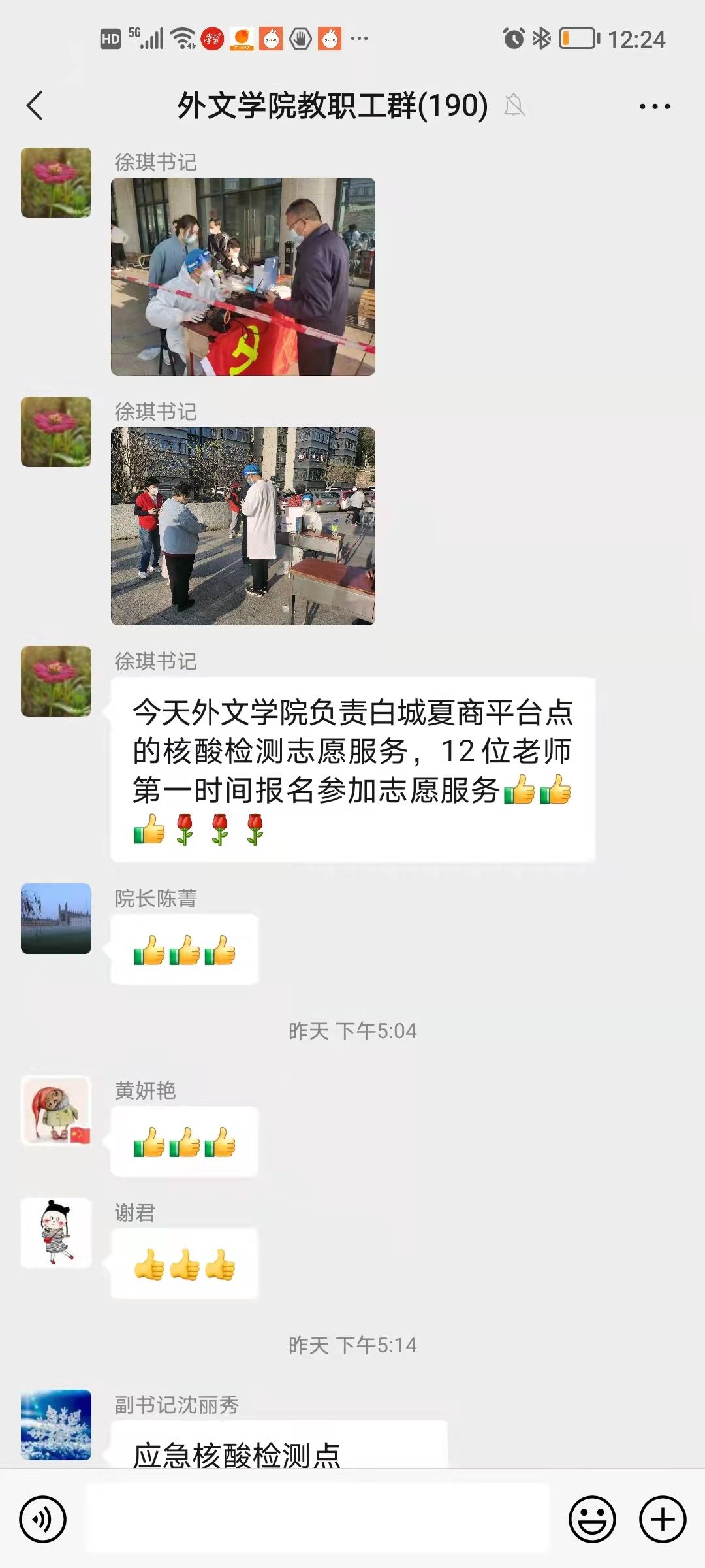 3月19日,为贯彻落实习近平总书记在中央政治局常委会会议上关于疫情防控的重要讲话精神,落实学校疫情防控工作部署,外文学院党委书记徐琪紧急部署,举旗聚力,学院办公室、团委等密切配合,号召广大师生积极投身各项疫情防控志愿服务。多位党员闻令而动,踊跃报名,第一时间响应党组织号召,让党旗在战疫一线高高飘扬。在外文学院精心组织、校内外各有关部门通力配合下,19日下午白城核酸检测点工作任务圆满完成。校党委副书记徐进功亲临现场指导,信息与网络中心副主任吴宇力、人事处副处长陈斌、学院党委副书记沈丽秀等参与了现场工作。