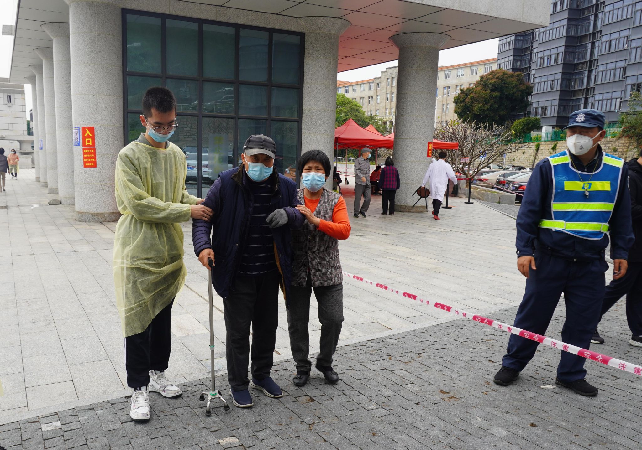 一位行动不便的老者在家人搀扶下来到检测点入口附近,徐琪书记见状,便协调在场医务负责人,为老人特事特办,开辟临时的“流动检测台”,由医务人员代为扫码登记,检测员主动上前检测,一分钟内便完成了老人及其家人的核酸检测。我们为有爱的医务组和志愿者点赞!