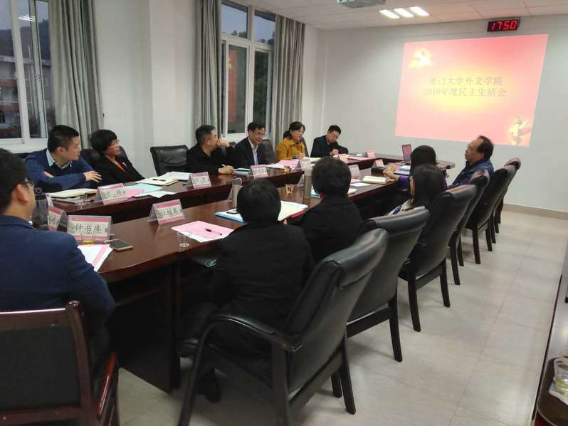 根据校党委统一部署,1月17日下午,外文学院召开2018年度中层党员领导干部民主生活会。校党委常委、副校长杨斌、校纪委委员郑树东、校第五督导组副组长曾铮到会督导。外文学院中层党员领导干部出席了会议,学院党外中层领导干部陈菁院长,致公党厦门市委常委、厦大总支主委李美华副院长,民盟厦门市委委员、厦大总支主委吴光辉副院长与各系(部)正副主任、工会主席应邀列席会议。会议由外文学院党委书记陈志伟主持。