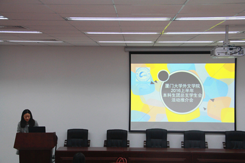 16日中午,学院本科生团总支学生会举行2016年度上半年外文学院主要学生活动推介会。作为中期述职大会的后续,各活动负责人向大家介绍了接下来学院即将开展的主要活动,如:第十九届“外研社杯”全国大学生英语辩论赛、“两学一做”党的知识竞赛、“跑神去哪儿”趣味定向越野、5?25心理活动月、暑期社会实践专题动员培训会等。本次推介会旨在打破部门界限,让更多的同学加入自己感兴趣的项目,增进各部门间的沟通与协作。