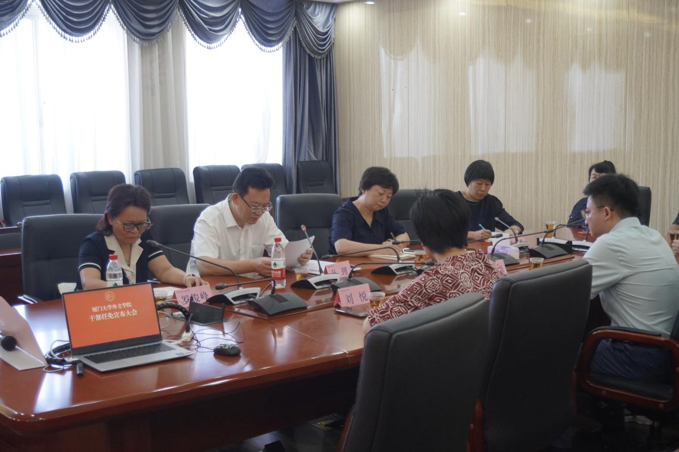 会上,孙理代表校党委宣布干部任免决定。经校党委研究决定,罗俊峰同志任中共厦门大学外文学院委员会委员、副书记,免去沈丽秀同志的中共厦门大学外文学院委员会副书记、委员职务。他对沈丽秀为外文学院所付出的努力和作出的积极贡献表示感谢,并简要介绍了罗俊峰同志的基本情况和工作经历,对学院今后的工作提出了几点希望和要求。