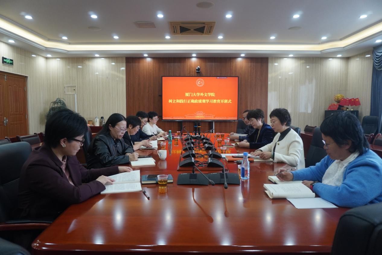 3月18日下午,外文学院在南光三515举行树立和践行正确政绩观学习教育开班式,学院领导班子全体成员参加。学院党委书记徐琪领学《习近平关于树立和践行正确政绩观论述摘编》节选内容,与会人员结合所学内容深入开展交流研讨。