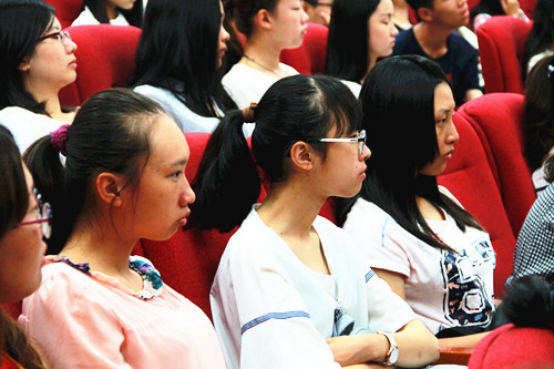 在场新生认真聆听 讲座过程中,苏教授结合个人经历,将抽象的政治理论讲解得生动有趣,现场气氛活跃,笑声连连。讲到慷慨激昂处,苏教授还即兴板书,解答同学们的疑惑,赢得了阵阵掌声。