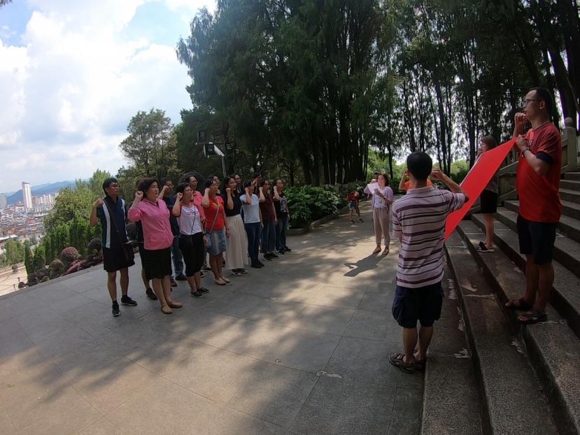 从纪念园的广场往上攀登,爬山91级台阶之后,到达了北山顶。山顶耸立着一座巍峨的纪念碑,碑的正面和背面分别镌刻着毛泽东题写的“革命烈士纪念碑”和“革命烈士永垂不朽”十五个大字。青松翠柏掩映下的纪念碑,格外地庄严肃穆。我们取出党旗,全体党员在纪念碑前排好队拉好党旗,举起右拳庄严宣誓。当宣读入党誓词整齐宏亮的声音响起,我们感受到了在这片热土上浴血奋战的革命先烈们,对于国家和人民的赤胆忠心,我们也感受到了在二十一世纪努力建设强大祖国、实现中华民族伟大复兴的一份沉甸甸的责任。