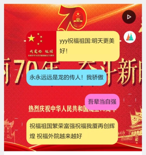 在伟大的中国共产党领导下,中华人民共和国七十载披荆斩棘、砥砺前行,繁荣昌盛、蒸蒸日上。身为华夏儿女,我们每个人都为此感到光荣和骄傲。未来,外文学院的全体师生要更加紧密地团结在以习近平同志为核心的党中央周围,奋发图强,锐意进取,积极投身一流学院和一流学科的建设,以培养为中华民族伟大复兴服务的外语人才为己任,助力厦门大学的发展,为祖国实现“两个一百年”奋斗目标贡献自己的一份力量!
