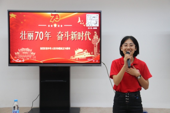 会后,师生们纷纷表达对祖国的衷心祝福和为实现伟大复兴的中国梦努力奋斗的坚定决心。团委副书记肖盈老师说道:“‘同心共筑中国梦’的群众游行道出了亿万人民的心声,‘立德树人’方阵让我心潮澎湃。作为辅导员,我将继续锤炼自己的政治品格、敬业精神和品德修为,承担起为党育人、为国育才的使命责任,助力当代大学生坚定理想信念、厚植家国情怀。”本科生第三党支部书记、2016级日语专业学生左彩凤说:“因为祖国的强大,我们更有自信,更加坚定,无所畏惧。作为外文学子,我们今后会利用语言优势,走向世界,但无论我们走到那里,我们和祖国一刻也不能分割。我们将把青春深深刻在这片热土之上,为中华之复兴而奋斗。”