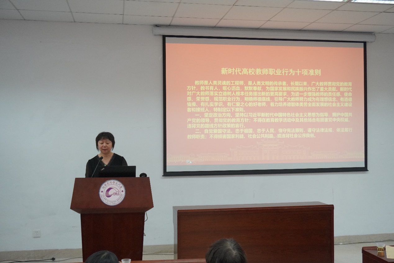 会上,陈志伟书记通报了师德负面案例,并强调了学院年度师德师风考核评价流程。她指出,学院全体教职工要严格遵守教师职业规范和职业道德,强化底线、红线意识,真正把教书育人和自我修养结合起来,时刻做到自警、自省。她强调,学院对于违反师德师风的问题,坚持“零容忍”原则,同时,学院将层层压实师德师风建设的主体责任,时刻紧绷师德底线这根弦,从源头上防范和遏制违反师德事件的发生。