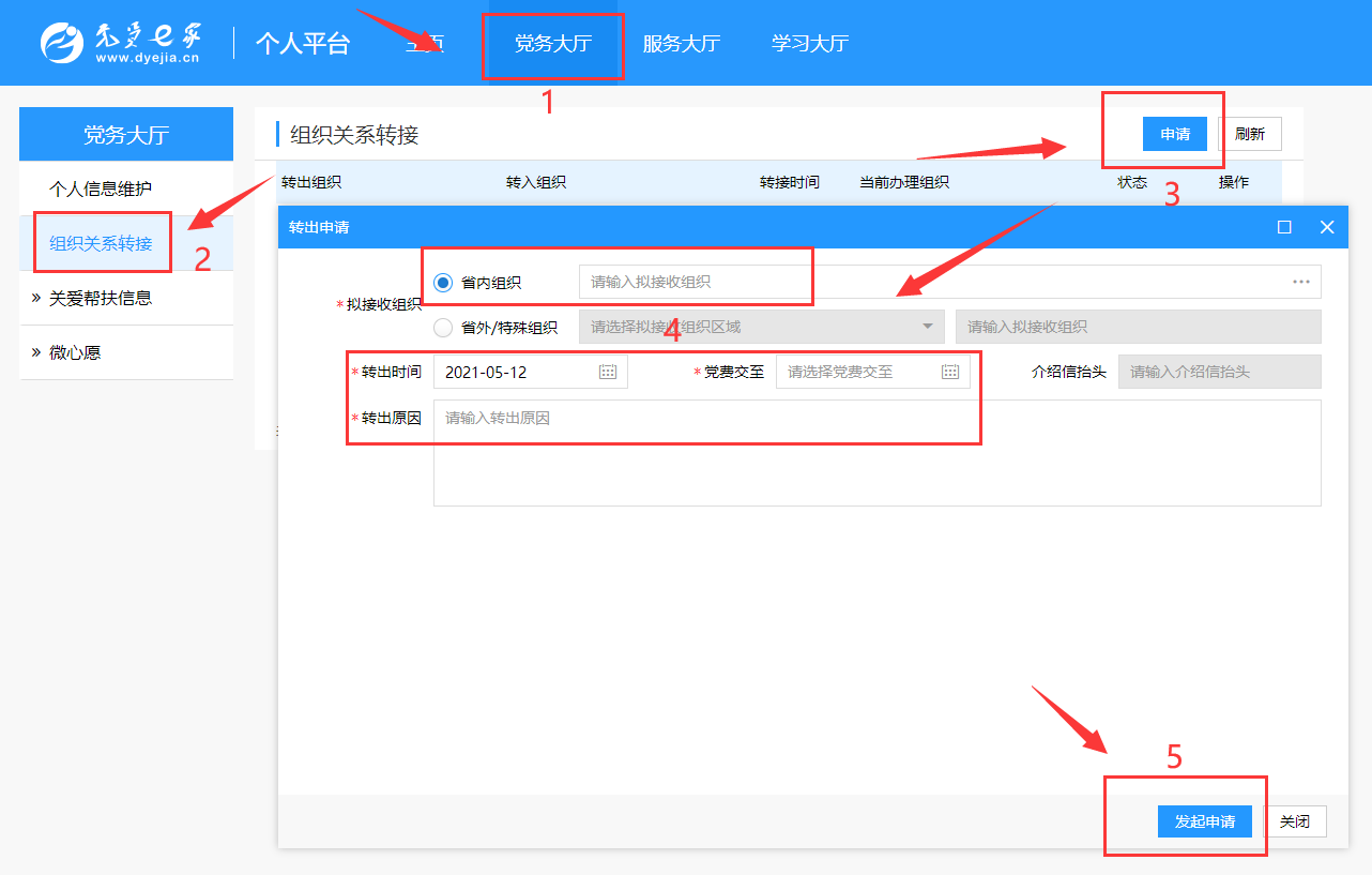 党员登录“党员e家”平台(www.dyejia.cn)→点击“登录”→登录个人平台→进入“党务大厅”→选择“组织关系接转”→点击“申请”→选择“省内组织”→填写拟接收党支部名称(中共厦门大学外文学院2021级新生支部委员会)→填写其他转出信息→点击“发起申请”,等待党组织逐级审批。如下图所示。