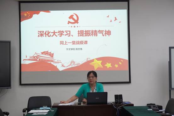 接下来,学院党委书记陈志伟带头作重点发言,为与会人员讲授了题为“深化大学习、提振精气神——同上一堂战‘疫’课”的微党课。陈志伟从“树党旗,当抗疫一线先锋队”“做表率,当疫情防控主力军”“勇担当,当师生健康守护人”“压责任,攻坚克难抓落实”四个方面,生动讲述了疫情发生以来,学院党委、各基层党支部和师生党员积极投身疫情防控、线上教学、学生错峰返校、复学复课等工作,主动热忱服务师生、服务社会的抗“疫”故事。陈志伟表示,中心组成员要切实提高政治站位,深化大学习、提振精气神,通过“固定党日+”、“双周政治理论学习”和庆祝建党99周年系列活动,深入学习贯彻习近平新时代中国特色社会主义思想,持续巩固“不忘初心、牢记使命”主题教育成果,以更加坚定的信心、更加昂扬的斗志、更加稳健的步调,坚决克服疫情影响,强化使命担当,对标对表学校“双一流”建设要求,加快学院改革发展,推动一流学科建设。