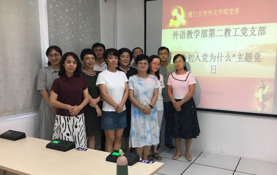 根据外文学院党委“不忘初心、牢记使命”主题教育的工作部署,外语教学部教工第二党支部于2019年9月19日下午在学院南光三223开展第一次“固定党日+”活动,活动主题为“当初入党为什么”。支部书记汪文娟主持活动。此次主题党日活动应到会11人,实到11人,其中正式党员10人,预备党员1人。