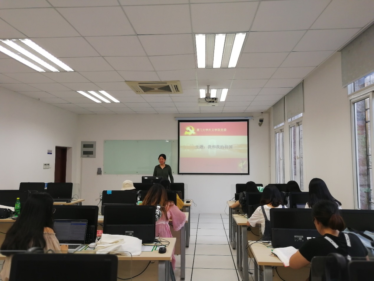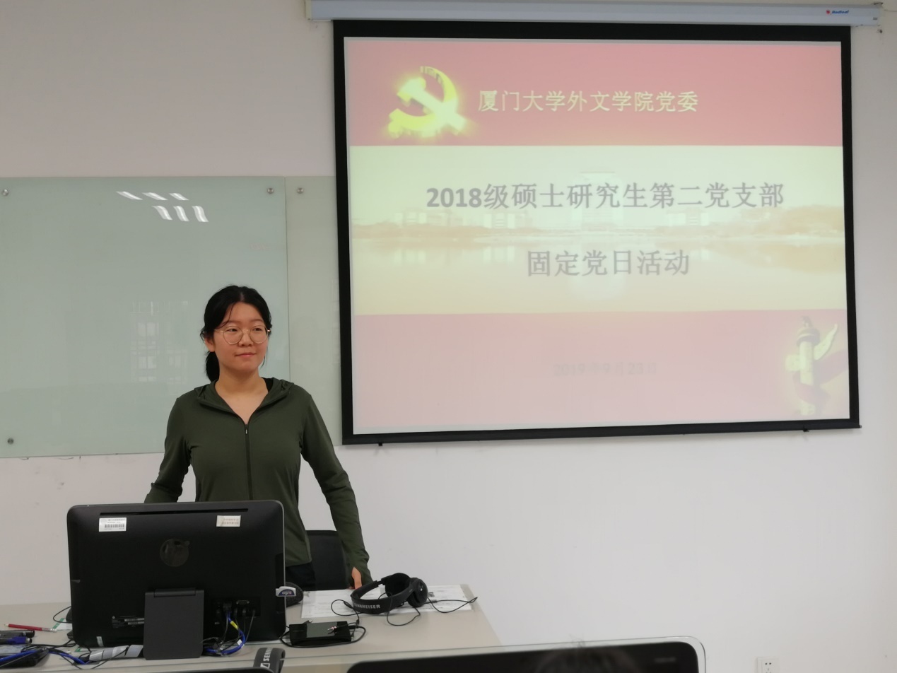2019年9月23日下午,外文学院2018级硕士研究生第二党支部在南光三222开展“我和我的祖国”主题固定党日+活动,支部书记孙猛主持活动。