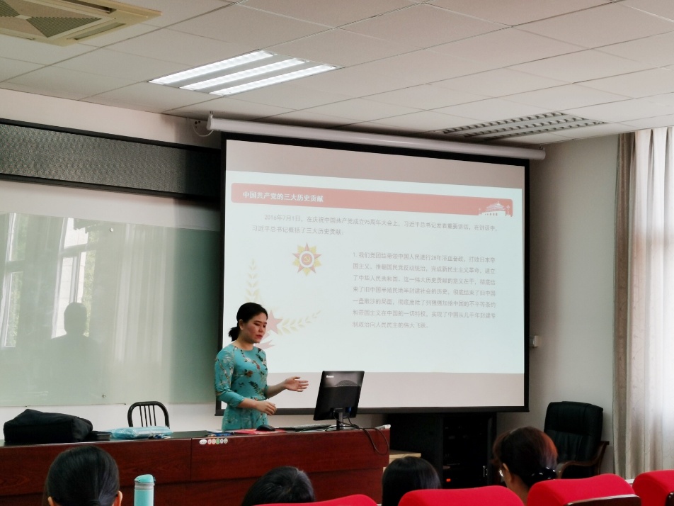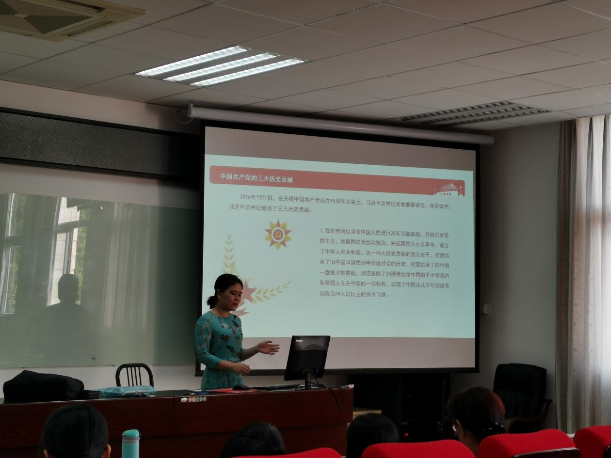 活动开始,支部书记方芳带领全体党员重温中国共产党的三大历史贡献:完成了反帝反封建反官僚资本主义的任务,结束了半殖民地半封建社会的历史;消灭了剥削制度和剥削阶级,确立了社会主义制度;开创了建设有中国特色的社会主义道路,逐步迈向社会主义现代化。然后,在接下来的发言里,方芳同志将理论联系实际,围绕“不忘初心、牢记使命”的精神实质,结合大学教师的初心和使命,对如何把爱国奋斗精神与具体教学工作相结合等方面进行了深入浅出,理论联系实际的讲评。