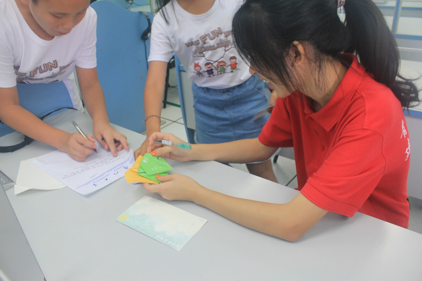 为了提高营员们对课程的接受度和参与度,实践队员们根据营员的年龄大小与英语水平,有针对性地设计课堂内容和教学形式。为了帮助营员们更好地巩固前四日所学,负责低年级教学的实践队员们将新课与复习相结合,在教授新知识点的同时,穿插对已学内容的提问与检查;并通过开展“你画我猜”、“单词抢答”、“Hangman”等趣味游戏,在欢笑声中加深营员们对单词与句式的印象,真正实现了玩中学,学中乐,乐有所获。