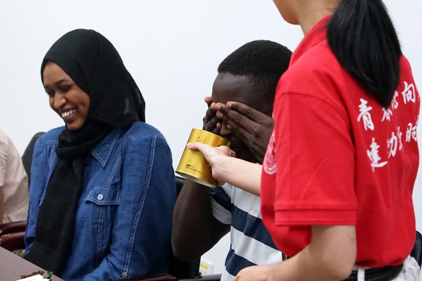 详细的理论讲解后,实践队员们手把手指导留学生们如何泡茶。大家纷纷选择了自己喜欢的茶叶,亲手沏茶、品茶。在茶叶的芳香中,留学生们亲身感受了中国茶文化的魅力。实践活动还特别设计了轻松有趣的游戏环节,留学生们通过香气来分辨不同种类的茶叶,现场欢声阵阵,气氛十分热烈。在最后,实践队员让留学生们挑选各自最喜欢的茶叶,并将茶叶赠予他们留作纪念。