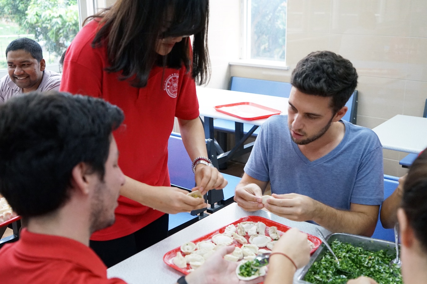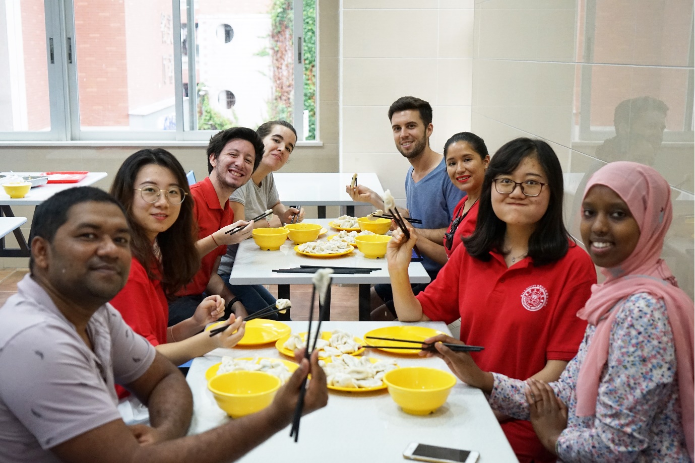 课程开始前,实践队员们到食堂窗口取出了早已准备好的饺子皮、馅料、面粉等材料,为动手实践环节做准备。课程伊始,实践队员们向留学生简要介绍了饺子的起源、分类及其特殊的文化含义。随后,实践队员们手把手教留学生如何包饺子,留学生们仔细模仿、耐心学习,从最初的不知所措到后来的游刃有余,再到熟练掌握了各式包饺子技巧,现场气氛格外和睦融洽。最后,实践队员们将包好的饺子交给食堂阿姨下锅,并与留学生们一同分享。品尝着一盘盘热腾腾的饺子,留学生们的脸上浮现出满足的笑容。