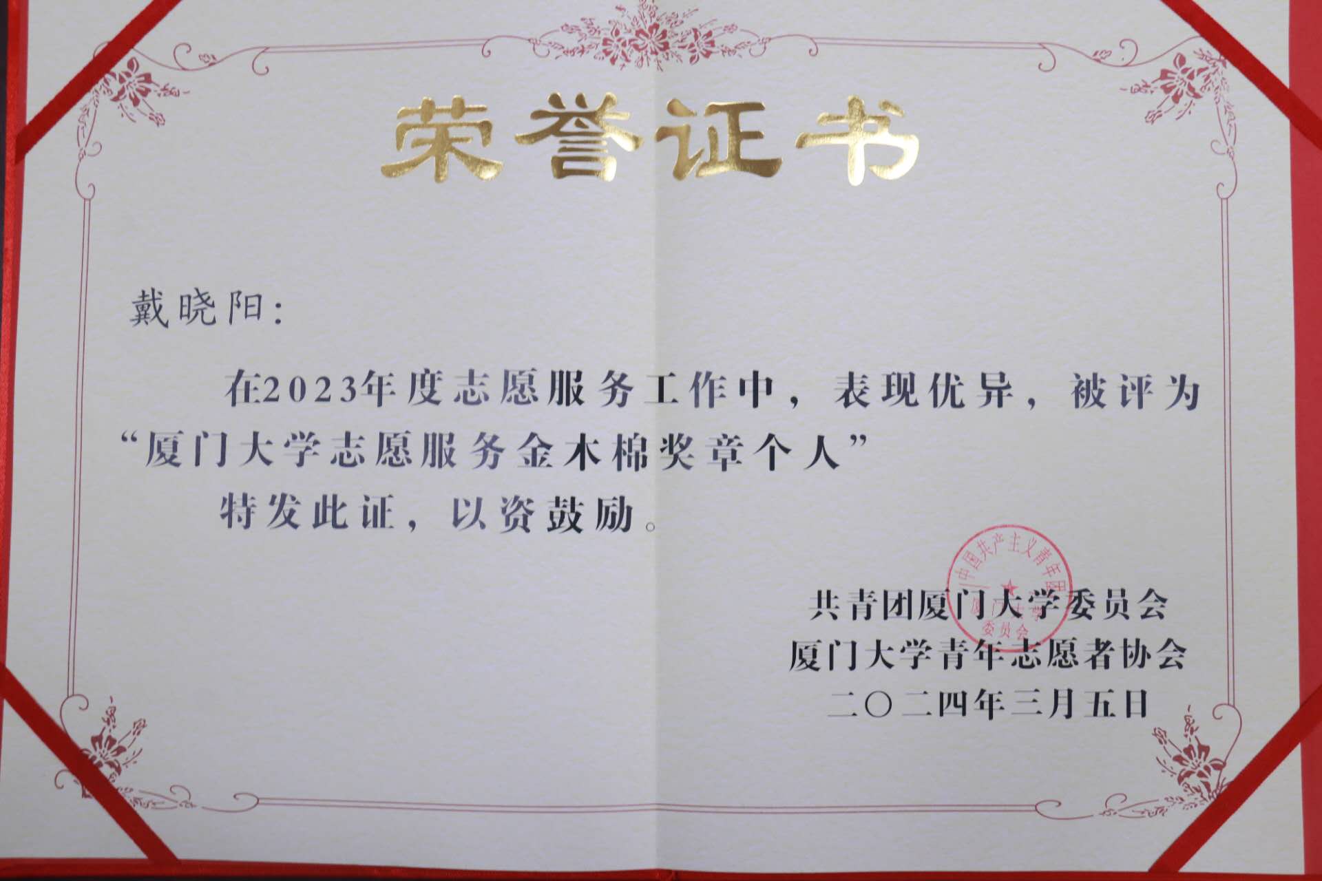 戴晓阳荣获“厦门大学志愿服务金木棉奖章个人”