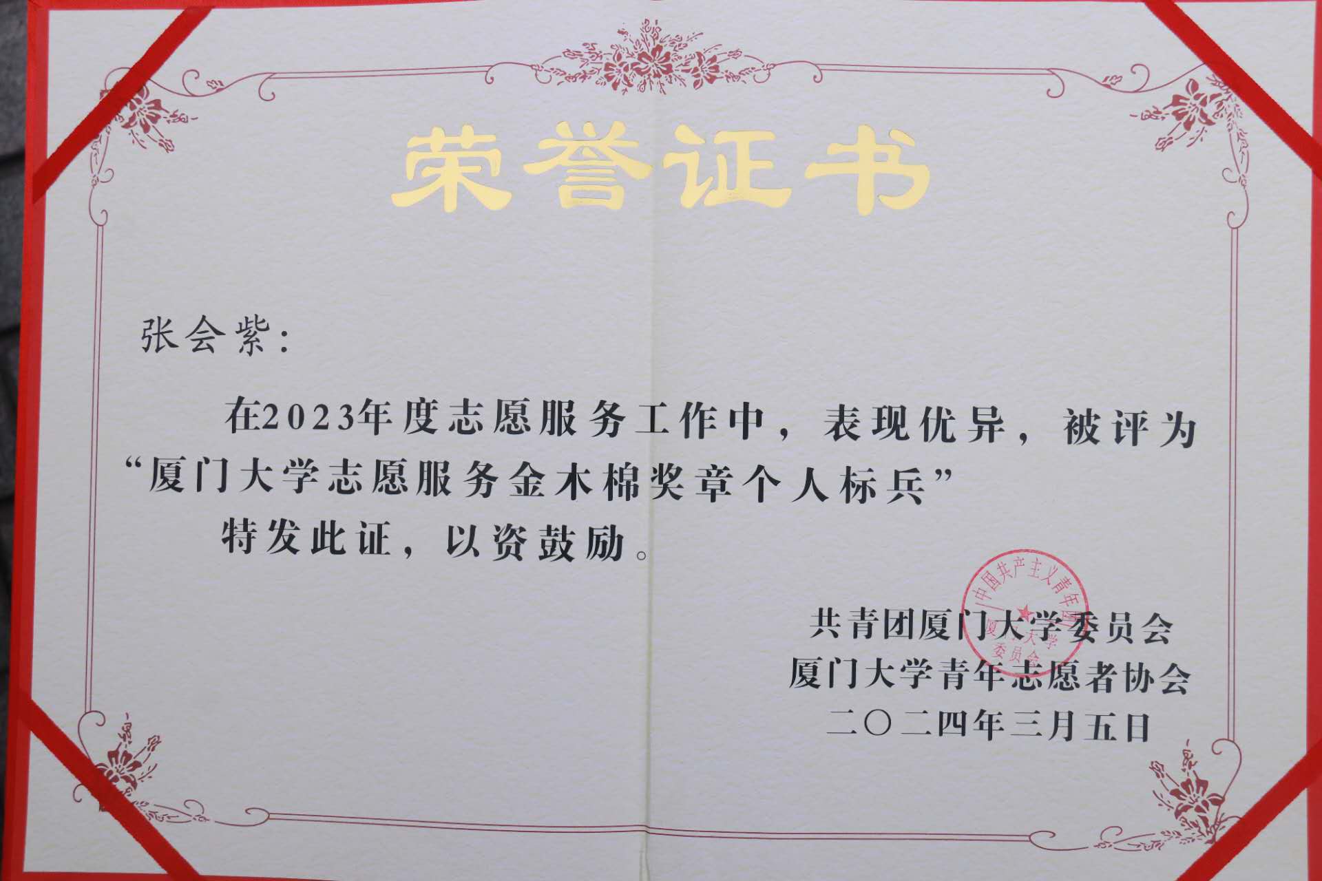 张会紫荣获“厦门大学志愿服务金木棉奖章个人标兵”