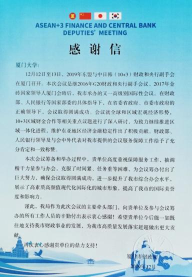 近日,厦门市财政局向厦门大学、厦门大学外文学院分别寄来了感谢信,向参与助力2019年东盟与中日韩(10+3)财政和央行副手会召开的志愿者们寄来了荣誉证书,感谢在会议的筹备和举办过程中,华体网志愿者们克服了时间紧、任务重等困难,辛勤工作,协助厦门市财政局保证会议取得了圆满成功。
