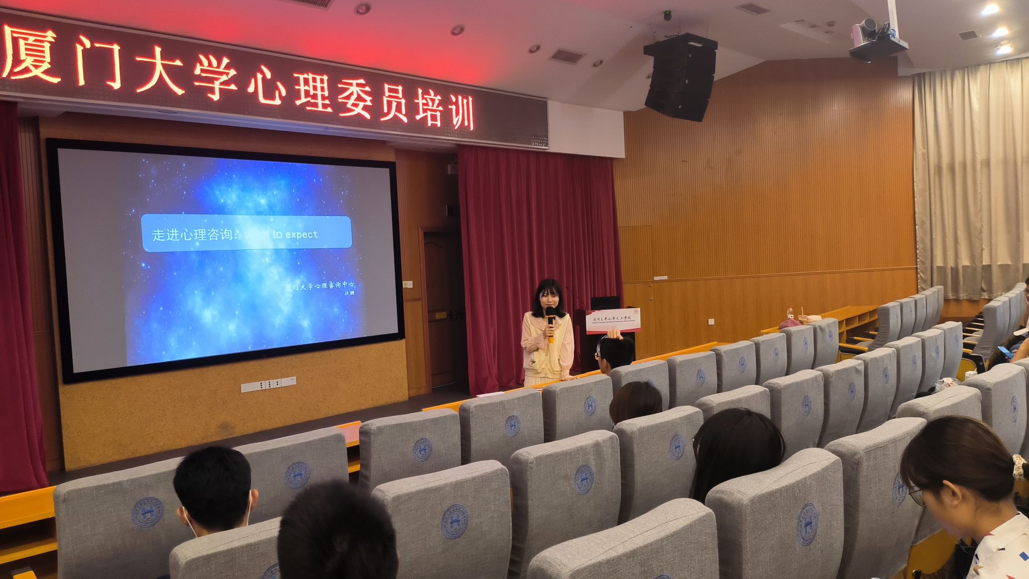 为提高心理委员群体工作能力,做好学生心理健康工作,厦门大学校心理咨询与教育中心组织开展了2022级心理学生干部培训活动。本次培训采取线上线下相结合的方式。线下心理委员的培训活动于2022年10月30日在化学报告厅开展,2022级全体宿舍心理联络员的培训采取易班线上观看视频的方式进行。