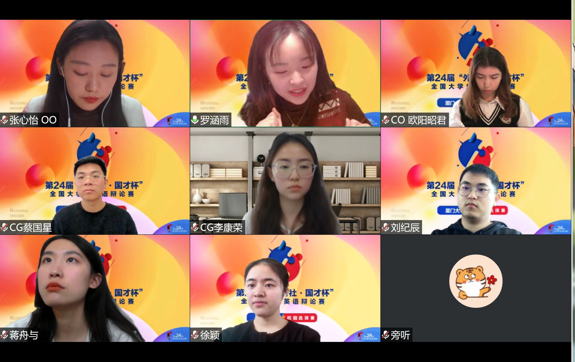 2022年3月12日,第24届“外研社·国才杯”全国大学生英语辩论赛厦门大学选拔赛在线上顺利举办。外文学院2018级英语专业本科生罗涵雨、欧阳昭君组队摘得冠军及最佳辩手称号;经济学院刘纪辰、徐颖组队荣获亚军;外文学院蔡国星、李康荣组队,法学院蒋舟与、外文学院张心怡组队荣获季军。冠军罗涵雨和欧阳昭君将代表厦门大学参加4月份举行的外研社全国大学生英语辩论赛华南赛区的比赛,和100多所高等院校争夺全国总决赛的入场券。热烈祝贺!