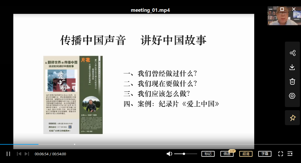 4月12日晚7时,厦门大学外文学院讲座教授范捷平老师在线上平台为广大师生带来了题为“从翻译世界到传播中国——谈谈如何讲好中国故事”的精彩讲座。范老师以其担任国际撰稿的纪录片《爱上中国》为例,分享了自己传播中国故事的理念和丰富经历。讲座由外文学院副院长刘悦教授主持。