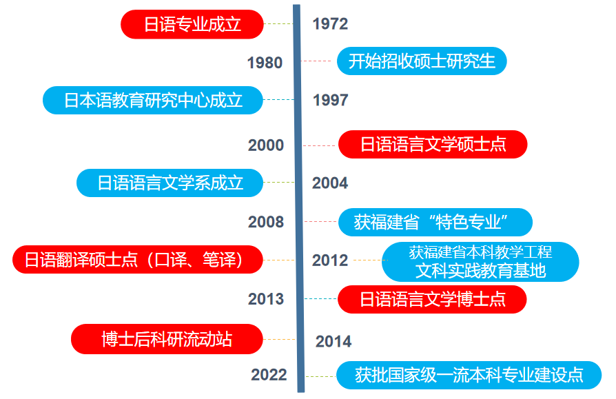 日语专业是我国东南沿海地区和经济特区中唯一完整设有本硕博、翻译硕士(日语口译、日语笔译)及博士后科研流动站的专业,也是全国最早获准招收本科和硕士研究生的专业之一。日语专业成立于1972年,拥有省级特色专业、省级文科实践教育基地、宝钢优秀教师、省级教学名师等。在校生质量、学科声誉、毕业生质量分列第5、10、11位(第4轮学科评估)。