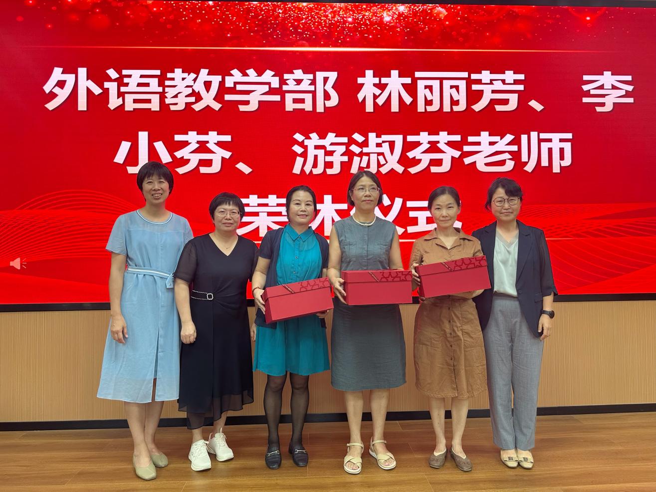 大会举行了退休教职工荣休仪式,院党委副书记沈丽秀、副院长江桂英、外语教学部主任李素英为荣休教职工林丽芳、李小芬、游淑芬颁发纪念品,教师代表向三位老师献花。陈菁院长代表学院全体师生感谢她们数十年如一日在三尺讲台上的辛勤耕耘和默默奉献,并衷心祝愿她们生活愉快、健康幸福,也希望她们常回学院看看,继续为学院发展贡献力量。三位老师纷纷表达了对学院的感激之情,并祝愿学院越来越好。