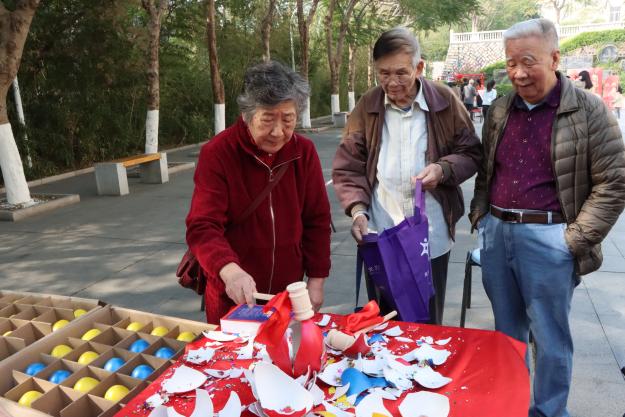 游园会上,学院为教师们精心准备了“金锣开泰”“彩蛋狂欢”“喜气临门”和“五福纳祥”小游戏,每个游戏都备有小奖品。教师们一边排队游戏,一边交流话家常。学院领导向退休教师们报告了学院近一年来的发展成绩和接下来一年的工作计划,同时希望老同志们保重身体,常回学院看看,关注学院的发展。久别重逢的聚会让每一位老师的脸上都洋溢着喜悦的笑容。