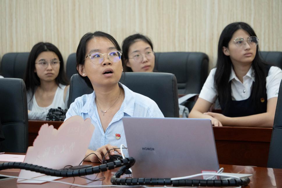 徐琪书记首先介绍了学院党委6月22日-24日在南平市建阳区、光泽县组织开展的“铭‘纪’于心铸忠诚,笃信培根担使命”实践教学活动。她表示,党员们通过实地参观考亭书院、金映茶园、圣农集团党建展示厅,深入学习了博大精深的朱熹理学思想,进一步了解乡村企业全力打造数字化生态茶园建设的成功经验,深刻感悟习近平总书记高瞻远瞩的战略思维。徐琪书记还简要地介绍了外文学院与光泽县教育局开展对口教育帮扶工作推进情况。最后,徐琪指出,“党员同志应牢记习近平总书记殷切嘱托,在生动实践中发挥外语学科优势,助力乡村振兴和教育帮扶,推动中华优秀传统文化的海外传播。”