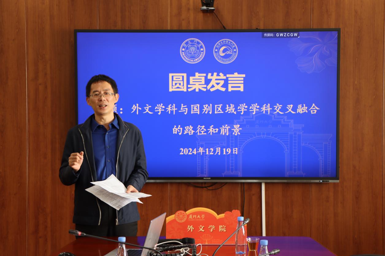 随后,与会嘉宾围绕“外文学科与国别区域学学科交叉融合的路径和前景”展开圆桌交流,由外文学院副院长刘悦教授主持。范捷平教授谈到,在时代浪潮的推动下,知识体系的动态转变已悄然发生,外语专业应以“应用研究”和“基础研究”为双轮驱动,行稳致远,坚持以服务国家和社会为导向,让交叉学科成果更多地服务于国家需求。厦门大学国际关系学院/南洋研究院院长高艳杰教授提出,国际关系学院/南洋研究院与外文学院合作紧密,目标一致,希望未来以常态化的师资互访促进知识融合,展开联合科研攻克难题,依靠学生交流培育新型人才,携手在学术创新与人才培养之路上大步前行。厦门大学国际关系学院/南洋研究院副院长张淼副教授围绕国际关系学院/南洋研究院招生培养举措、学科发展与挑战、田野调查的推进情况展开交流,探讨了如何依据学科特色制定精准的招生策略、创新人才培养模式以契合复合型人才培养需求。厦门大学外文学院副院长戴鸿斌教授认为,国别区域学科作为应用类研究,学科建设应紧密联系全球局势,着力于剖析不同区域的政治动态、经济贸易摩擦、文化交流困境等现实问题,为服务国家战略输送专业性人才。