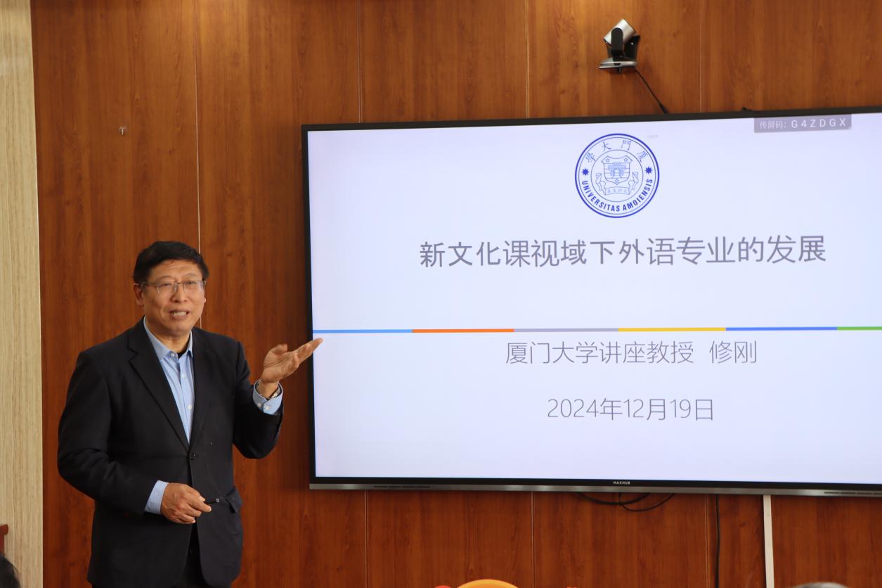 修刚教授围绕“新文化视域下外语专业的发展”进行发言。他谈到,新文科改革提倡的交叉融合型学习,给外语教育带来了与历史、政治、哲学、数字技术等多领域融合交叉的机遇,通过数字化、智慧化赋能,将大大提高多语教学效率,促进交叉融合的实现。外语教育的未来趋势必然是在文明互鉴下完成外语教育的使命,在数智赋能语言能力培养的基础上,向“学”与“用”转变,即培养区域国别学的“研究能力”或培养翻译、经营、商务、旅游等“应用能力”。他相信,厦门大学会在向“学”转变上成为典范。