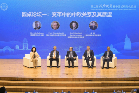 随后,第一场圆桌论坛“变革中的中欧关系及其展望”举行。埃里克·索尔海姆先生、皮诺·阿拉基教授、埃伯哈德·桑德施奈德教授和上海外国语大学姜锋研究员共同就中国现代化、多极化世界、一带一路和中欧合作等重要话题进行了充满真知灼见的深入探讨。厦门大学公共事务学院李明欢教授作总结发言。