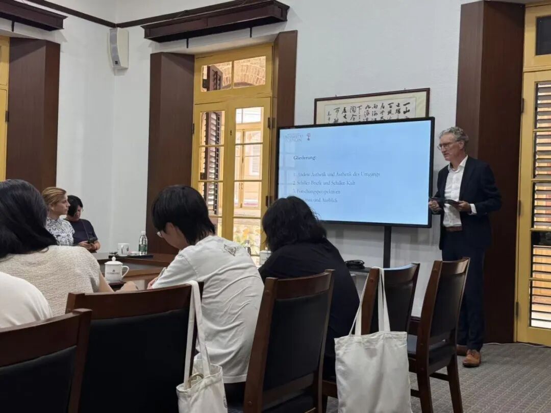 主旨报告环节由《文学之路》合作主编、海德堡大学教授Getrud Maria R?sch主持。海德堡大学教授Burckhard Dücker率先作题为“家庭文学作为社会和当代历史现象的反思空间”的主旨发言。《文学之路》合作主编、复旦大学教授魏育青的报告题为“从红旗到灰云——家庭叙事的多元性与共鸣”,聚焦译介成中文的德语家庭文学作品。中山大学教授Carsten Rohde作“在奥斯维辛集中营与生活艺术之间——以斯蒂芬·瓦克维的自传三部曲《看不见的国度》《新人类》《我母亲的画像》为例”的报告。中国科学院研究员方在庆从跨学科交叉角度,作题为“公众形象与私人自我之间——阿尔伯特?爱因斯坦与文化比较中的家庭形象”的主旨报告。《文学之路》合作主编、马格德堡大学教授Armin Burkhardt则以“家庭语言”概念的不同界定为切入点,作题为《家庭词汇的类型学与构成原则——基于日常及文学作品中的实例分析》的报告。