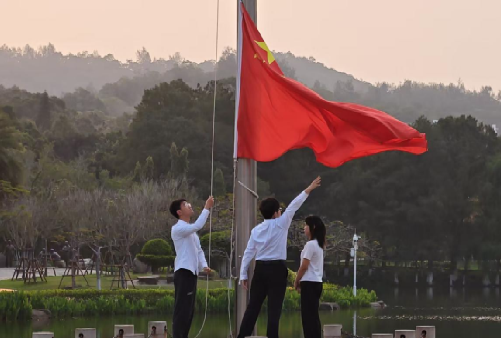 清晨,党支部成员首先齐聚于嘉庚广场。这里是“嘉庚精神”的具象载体,爱国传统深厚。在庄严的国歌声中,全体成员肃立行礼,目光追随着冉冉升起的五星红旗,心中的敬意与豪情随之升腾。随后,队伍步行至演武场,当国旗再次在演武场上空高高飘扬,青年党员们在升旗仪式中完成了一次对爱国主义的深刻体悟。升旗仪式结束后,全体党支部党员,面向鲜红党旗,重温了铿锵的入党誓词。“我志愿加入中国共产党……”的誓言在清晨的演武场上空回荡,将爱国情怀与对党忠诚融入青春血脉,为青年学子上了生动一课。