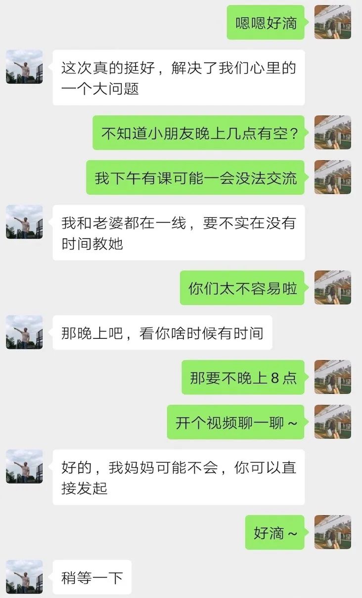 和对接的孩子协商之后,我们确定了每周进行一次2小时的线上辅导,讲解平时布置的练习。刚开始视频上课的时候,学生比较拘谨。但随着课程的进展,我们之间的距离感逐渐消失了,学生对我更加信任,而我们的课堂互动也取得了更好的成效。希望随着课程的进展,学生能够逐渐培养出对于英语学习的兴趣,提高英语成绩,让在前线奋战的家长不再有后顾之忧。
