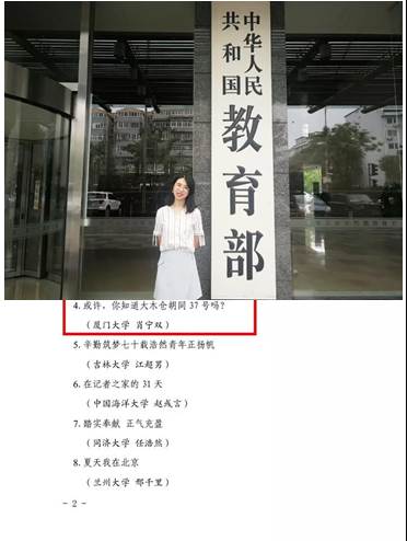 实习期间,肖宁双表现出较高的政治意识、责任意识,积极发挥所学所长,展现了当代大学生的精神风貌,得到了实习单位的充分肯定。她结合自己的实习经历和实习感悟,撰写了征文作品《或许,你知道大木仓胡同37号吗?》,表达了自己对中央和国家机关公务员的敬意和想要投身教育事业的决心,内容情真意切,最终从383篇征文中脱颖而出,获评一等奖(共10篇)。