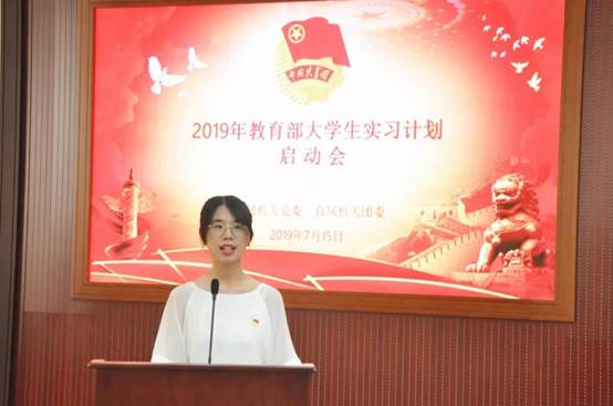 在2019年教育部大学生实习计划启动会上,肖宁双同学作为2019年教育部实习生代表在会上发言。