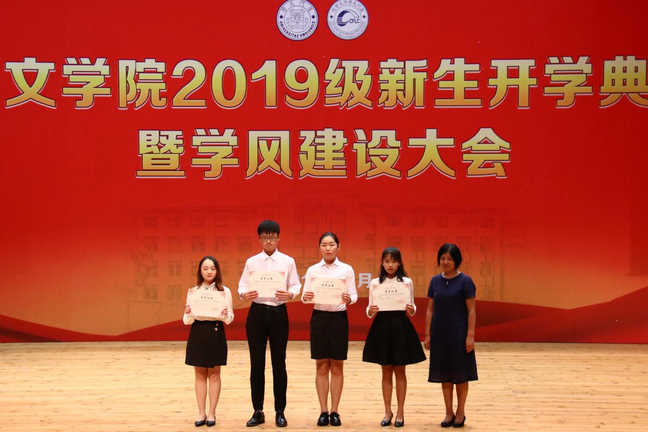 紧接着,典礼进入外文学院2018-2019学年荣誉称号、助学金与奖学金颁发环节。沈丽秀副书记宣读外文学院2018-2019学年荣誉称号表彰决定,李美华副院长宣读外文学院2018-2019学年助学金颁发决定。徐琪副院长宣读外文学院2018-2019学年奖学金颁发决定,在场领导老师及嘉宾依次为获奖者颁发证书。颁奖仪式是对过去一年里外文学子不忘初心、锐意进取的肯定,同时也激励着新生们在未来乘风破浪,勇攀高峰。
