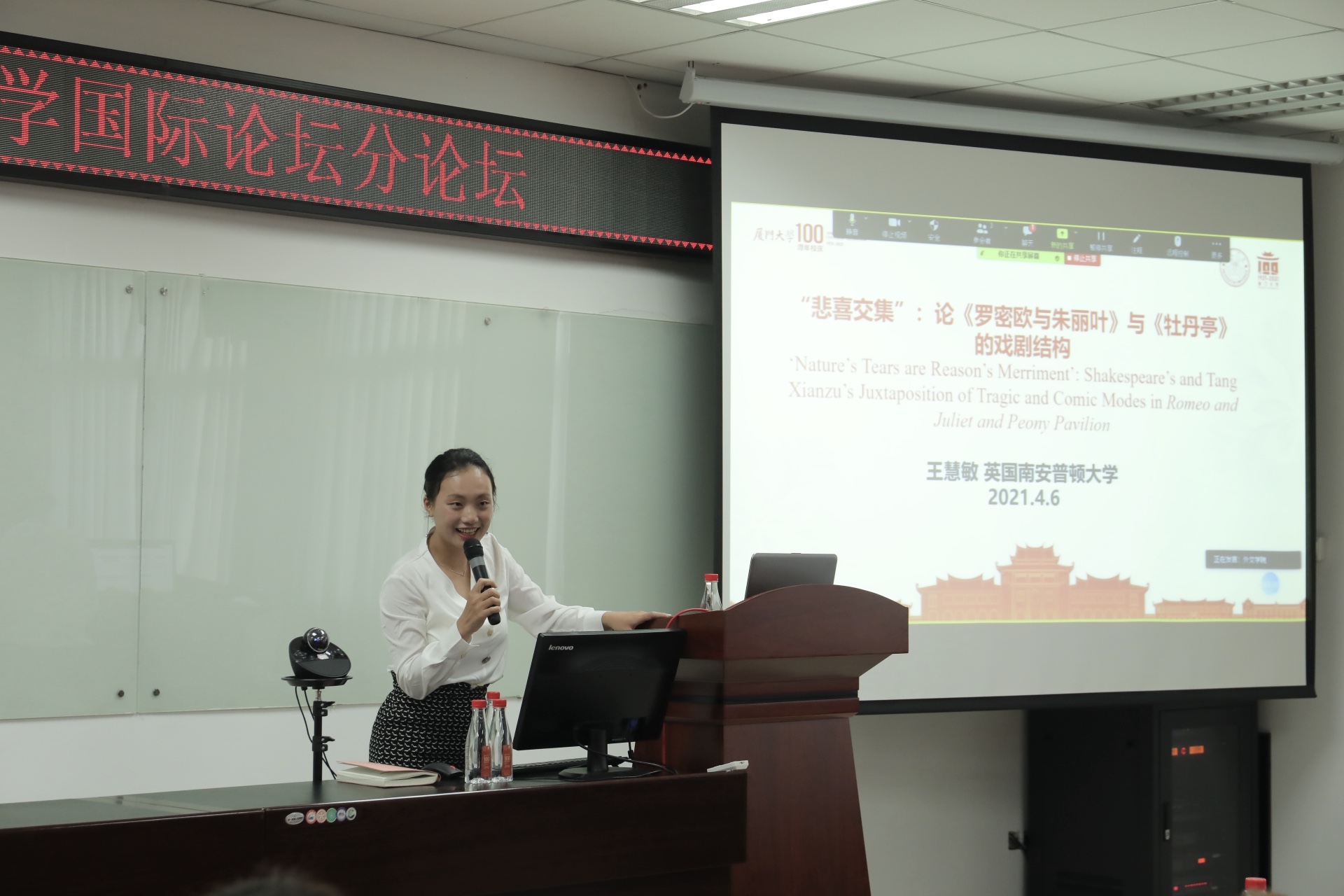 最后,英国南安普顿大学比较文学博士生王慧敏发表了题为“‘悲喜交集’:论《罗密欧与朱丽叶》与《牡丹亭》的戏剧结构”的演讲。她认为,两个文本中,女性的悲剧以及葬礼中讽刺性小人物出场安排的共同原因在于“悲喜交集”论。她提出朱丽叶和杜丽娘的悲剧都需要大众思考教育方式的问题,提议通过对比启发思考,并进一步指出针对当前现实问题的讨论将会是对这两部作品最好的改编。