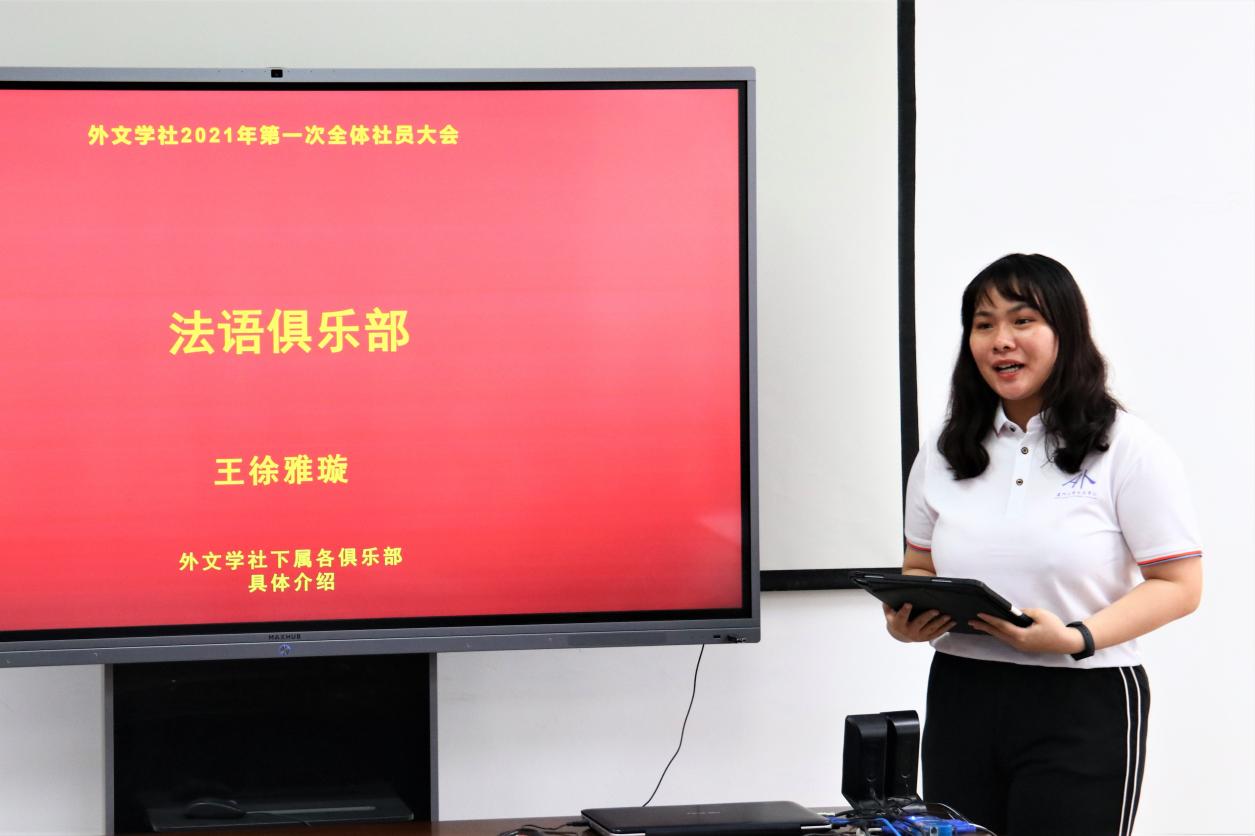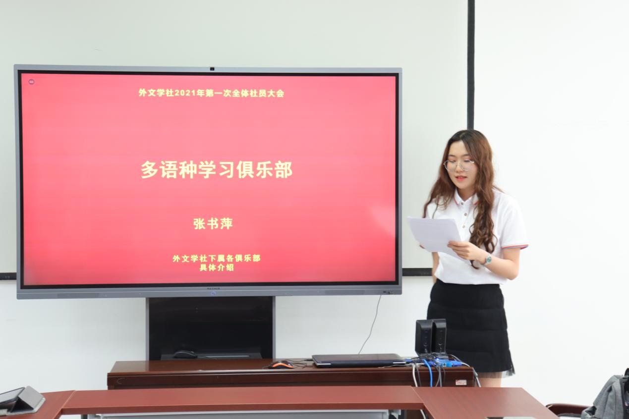接下来,外文学社下属各俱乐部负责人介绍了各个俱乐部的发展情况与未来发展规划。多语种俱乐部负责人、外文学院2019级英语专业本科生张书萍首先发言,她表示,过去一年里,多语种俱乐部积极开展了法语小课堂、德语小课堂、日语小课堂及英语角四项活动。未来,俱乐部将会继续发扬活动形式多样、氛围轻松、内容充实的优势,积极探索如movie night、优秀外语电影作品展映会、英语诗歌欣赏之夜、英文原著读书交流会等更加丰富多彩的活动形式。